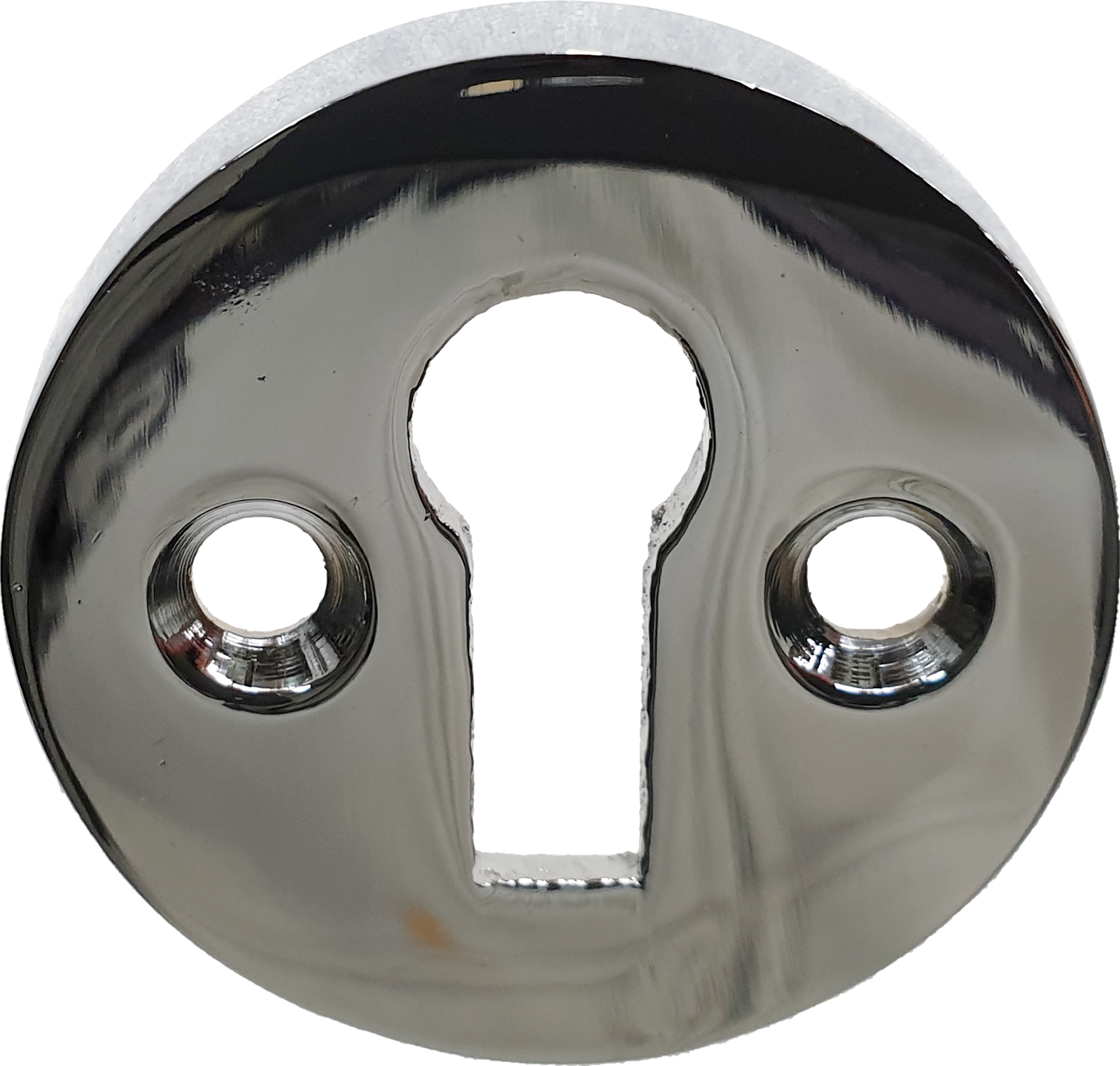 This standard open key rose escutcheon features a bright silver polished chrome finish, and measures 32mm in diameter, and 7mm thick.