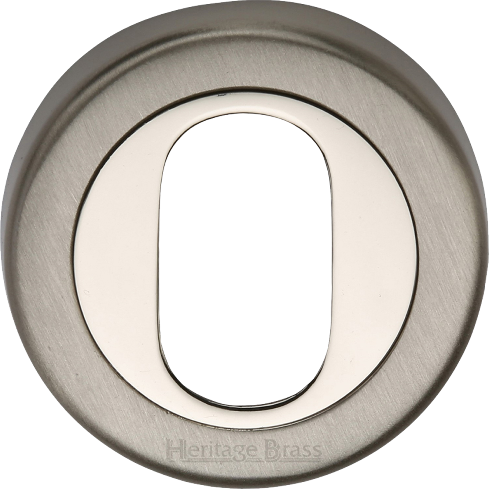 This premium UK quality oval cylinder lock escutcheon from the Heritage collection in a superior Mercury split finish satin nickel outer rose and polished nickel inner, is suited to oval profile cylinder locks, and features a two piece clip-on concealed fixing system for a modern plush look.