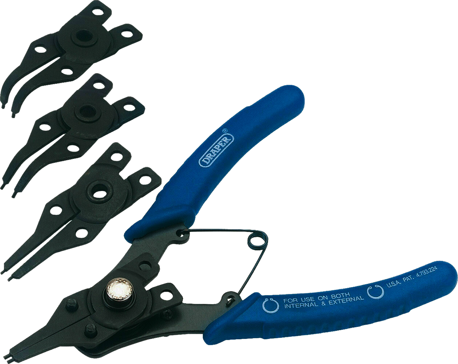Draper 5 piece combination circlip plier set for internal and external circlip removal and fitting. this set includes a standard and fine straight tip jaws, 45° & 90° degree tips.
